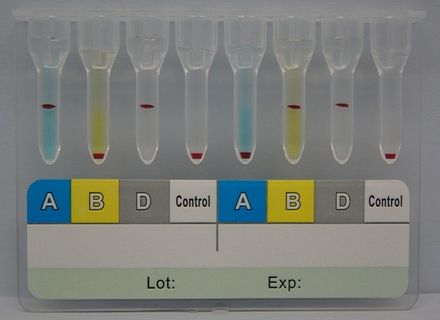 紅細胞懸液:取5%紅細胞懸液1-2滴,分別滴于A,B和陽性對照孔中,用牙簽輕輕混勻,上下左右傾斜,注意不要讓液體溢出。2分鐘內(nèi)觀察結(jié)果。